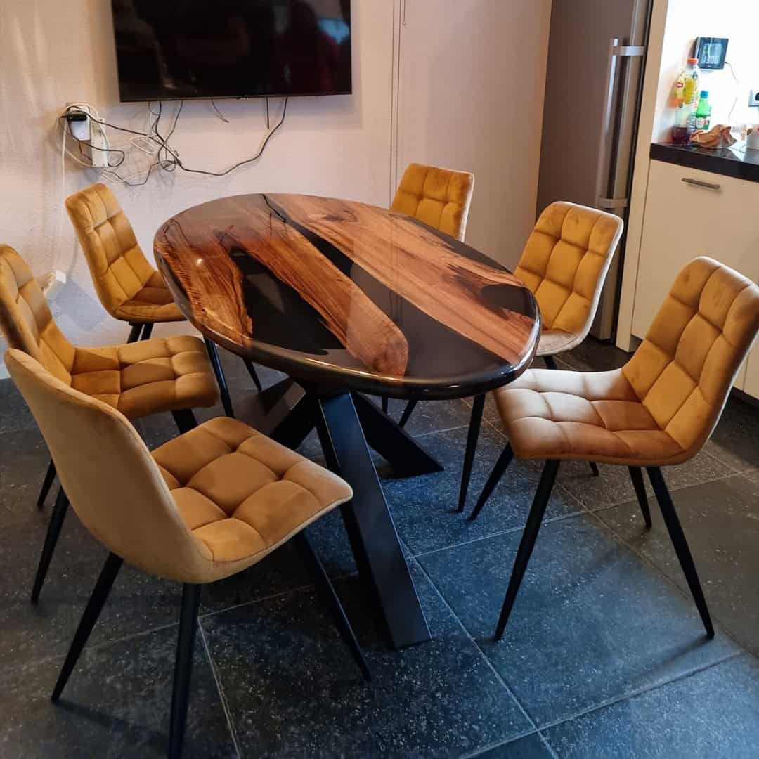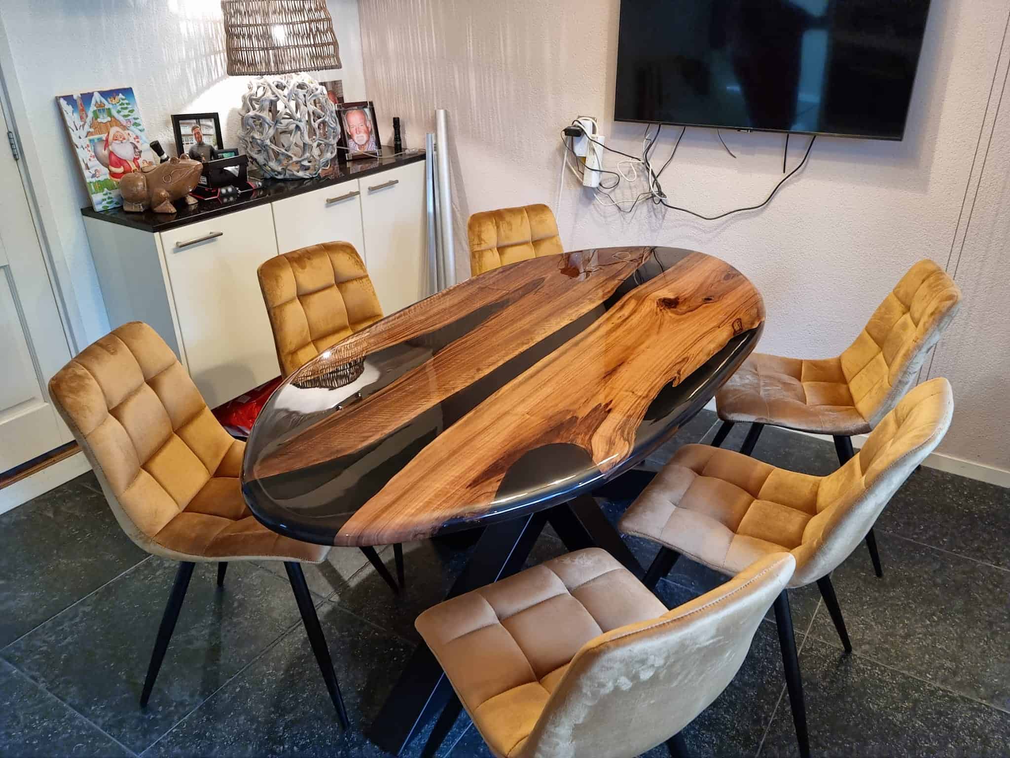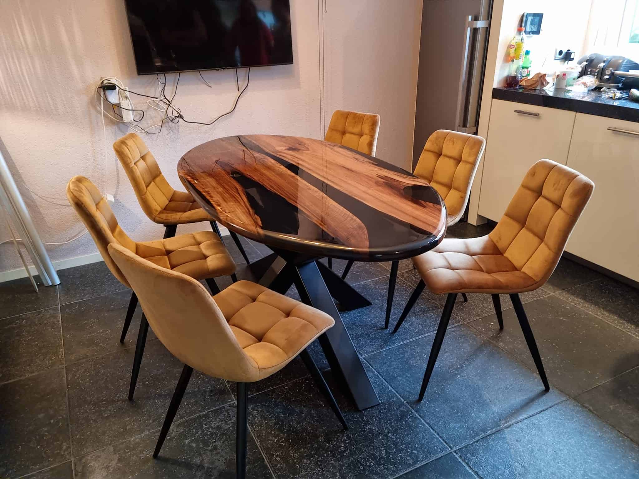 - Moderne stijl: De transparant zwarte epoxy geeft een eigentijds tintje aan jouw eetkamer.