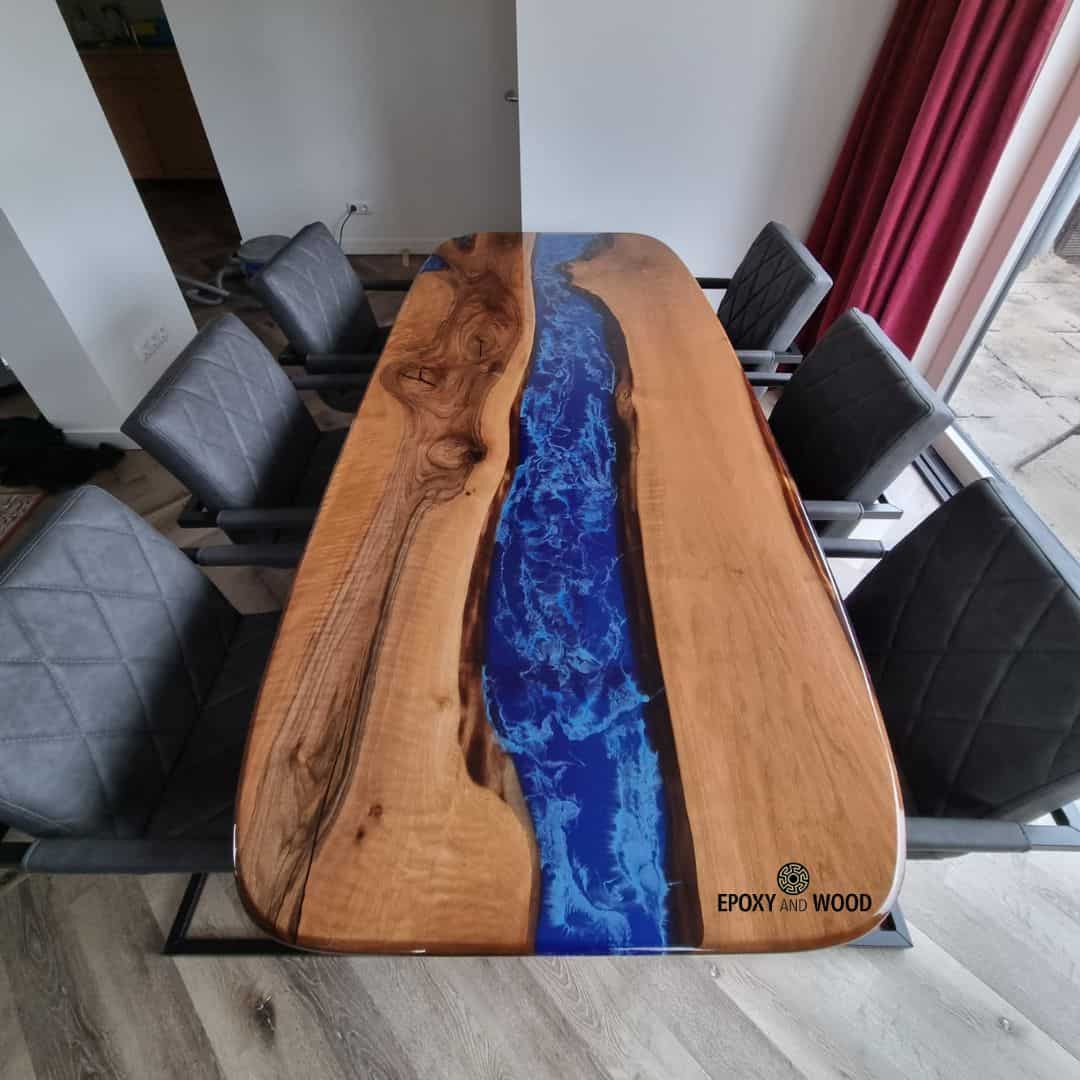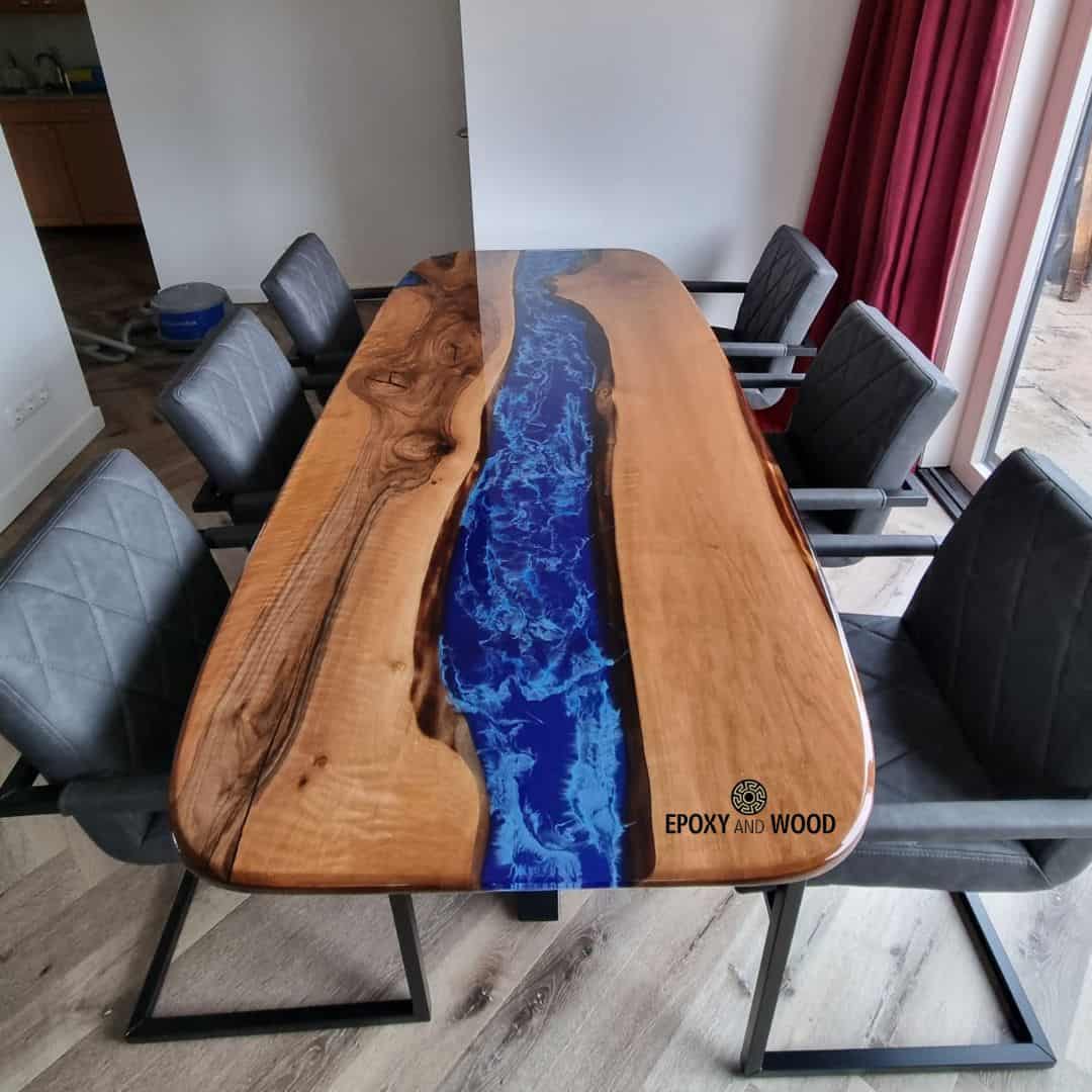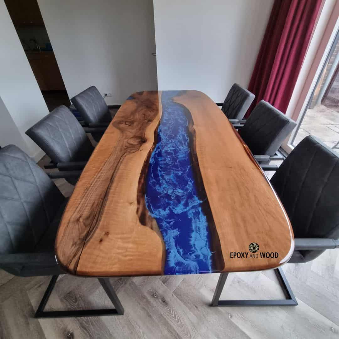 Bij Epoxy and Wood willen we niet alleen functionele meubelstukken creëren, maar echte kunstwerken die je interieur verrijken. Onze riviertafel is een perfect voorbeeld van deze filosofie. Met walnoothout als basis en een prachtige rivier gemaakt van verschillende tinten blauwe epoxy, wordt deze tafel een centraal punt in elke ruimte. Lees verder om te ontdekken waarom onze riviertafel ideaal is voor jouw interieur en waarom we trots zijn op ons maatwerk.