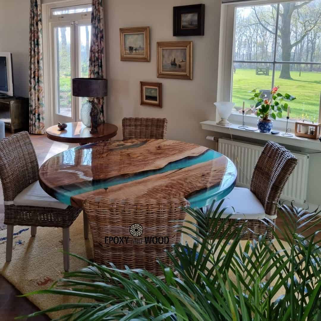- Unieke vorm en afwerking: Onze ronde tafel met oceaan groene epoxy is een uniek meesterwerk dat een verfijnde touch aan jouw interieur geeft.
